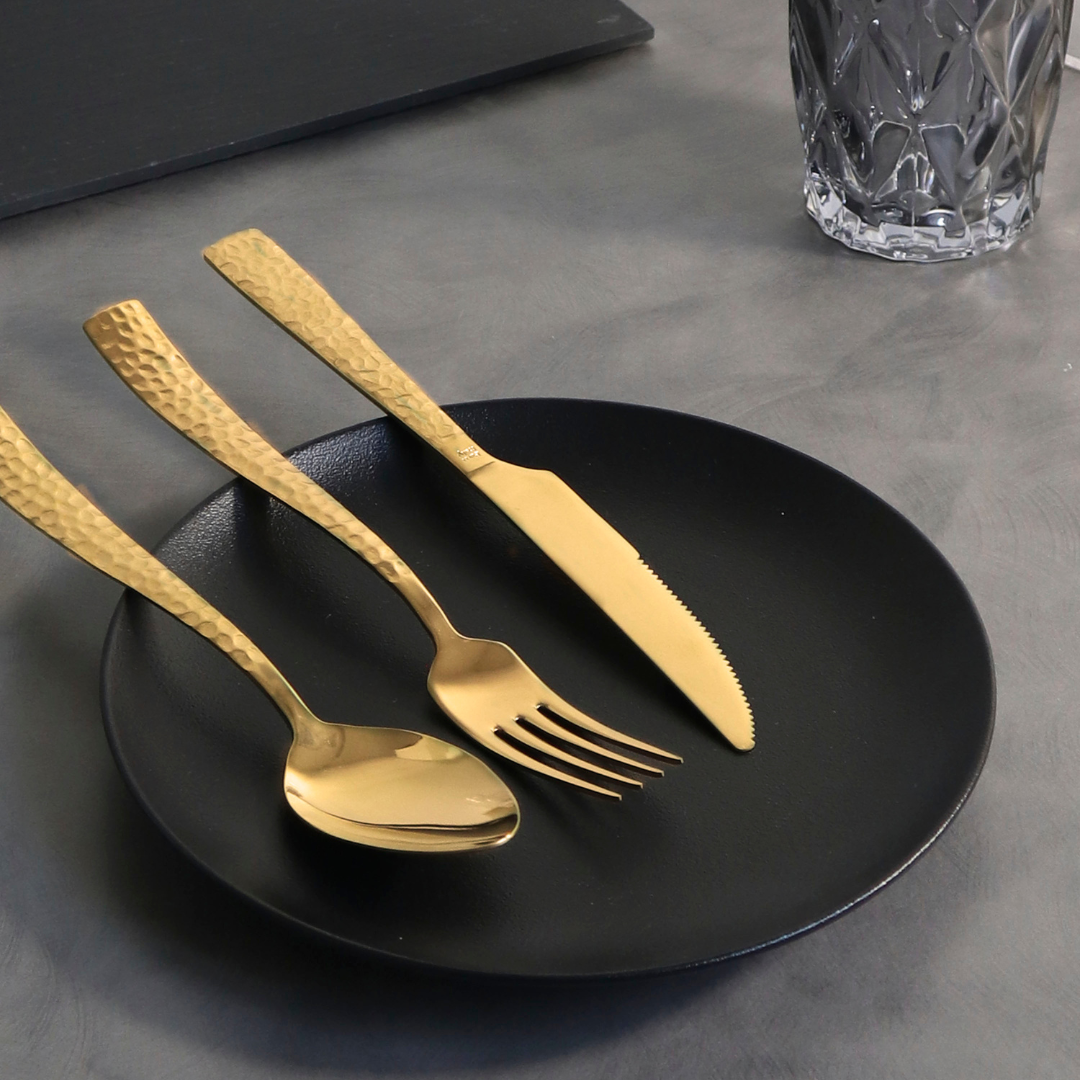 Scegli i set in PVD oro, bronzo o neri: La Mise en Place di Natale 2025 richiede accenti rame, cromo lucido e dettagli dorati per conferire calore e modernità.