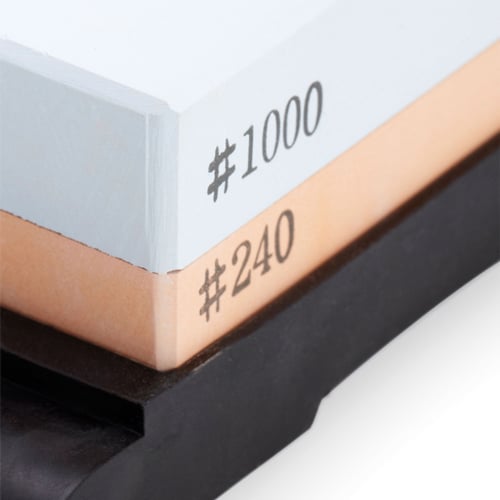 La custodia in plastica per il trasporto funge anche da supporto per la pietra durante l’affilatura. La confezione comprende anche due guide, una piccola e una grande. Le guide sono progettate per aiutare a mantenere l’angolo corretto mentre si affilano i coltelli.