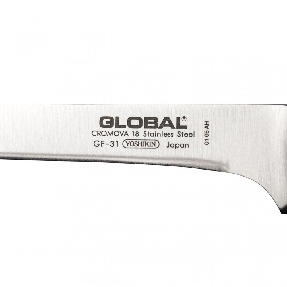 I primi coltelli GLOBAL furono progettati nel 1985 da Komin Yamada il cui scopo era sviluppare una gamma di coltelli veramente nuova e rivoluzionaria. I coltelli GLOBAL sono realizzati con il miglior materiale in acciaio inossidabile. Le lame utilizzano acciaio inossidabile CROMOVA 18, temperato a ghiaccio e indurito a Rockwell C56 ° -58 °, che mantiene un bordo affilato come un rasoio più lungo di qualsiasi altro acciaio e resiste a ruggine, macchie e corrosione.
