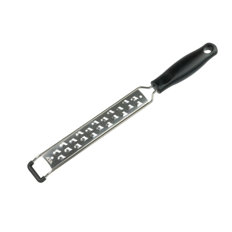 Grattugia da 34 cm con lama spessa in acciaio inox micro-affilata della linea Micro-Thech Basic e manico in polipropilene per una salda impugnatura. La lama affilatissima grattugia gli alimenti in modo uniforme esaltandone il gusto, è ideale per grattugiare buccia di limone, noce moscata e formaggi. Lo speciale metodo di lavorazione, la microforatura, impedisce che le lame perdano l’affilatura e si intasino durante l’utilizzo. L’impugnatura è realizzata in polipropilene stampata ad iniezione e fornita di foro per appenderla.