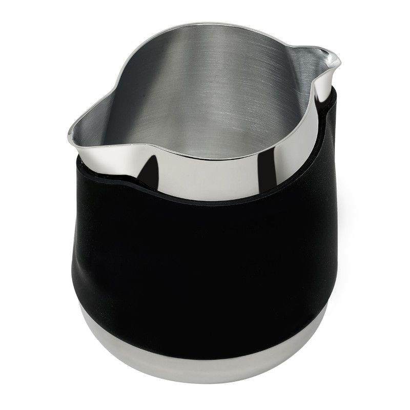 Lattiera per Cappuccino e Latte Art con due becchi a 180° serie Revolution Reverse in acciaio inox 18/10 e fascia in silicone con capacità 50 cl (6 tazze).