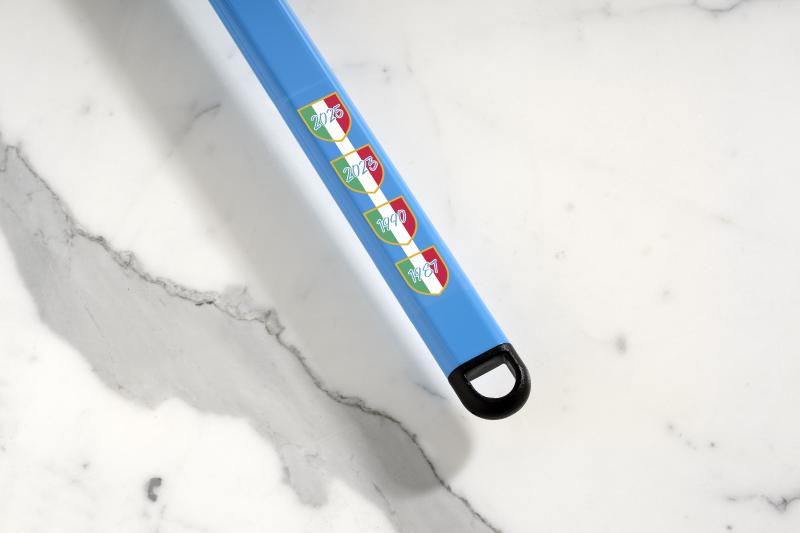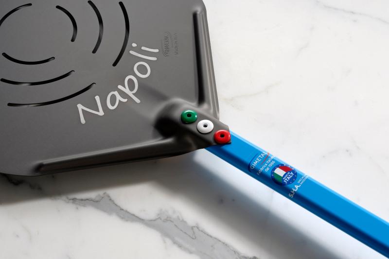 Pala pizza rettangolare asolata, linea NAPOLI di Gi.Metal, testa è in alluminio S.H.A. (Special Hard Anodizing) misure 36X36 cm, Manico S.P.C. – Special Powder Coated, del colore del Golfo di Napoli, lunghezza 150 cm. I 3 rivetti iconici di Gi.Metal si colorano dei colori della bandiera italiana, a simboleggiare la garanzia del Made in Italy. Assicurano stabilità e resistenza.