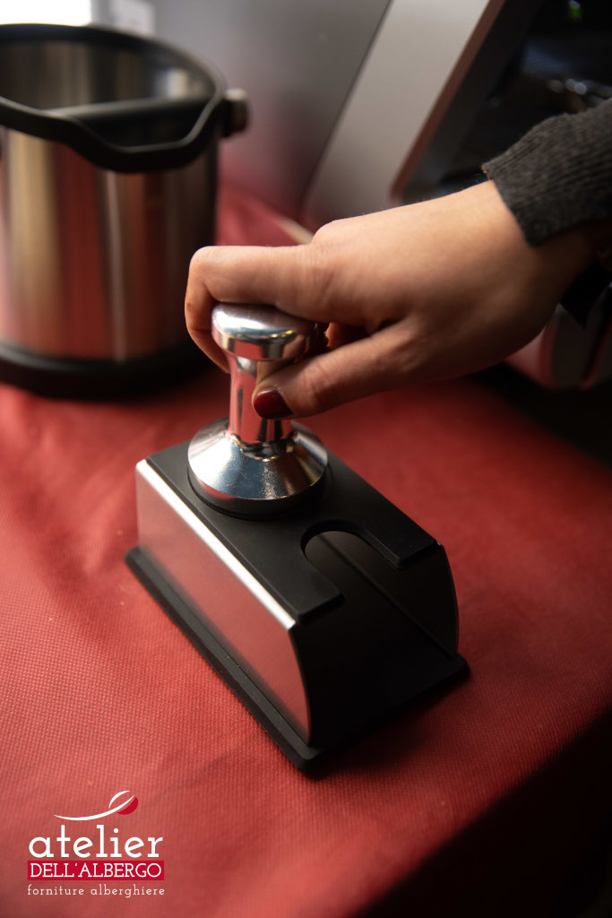 Porta gruppo in acciaio inox e silicone con dimensioni 14×9 cm ed altezza 6 cm, utile per appoggiare il filtro delle macchine del caffè, un pressino ed un cucchiaino. Permette di concentrare in pochissimo spazio tutti gli strumenti che occorrono per preparare un buon caffè.