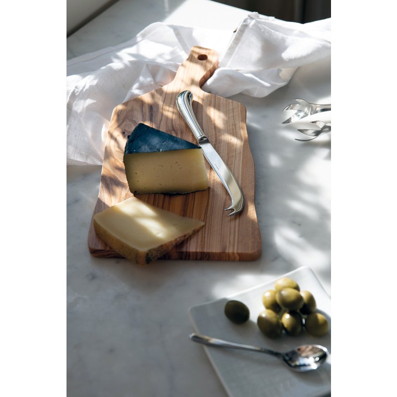 Tagliere a servire in legno di ulivo rettangolare dalla forma non lineare, con manico, di Paderno, misure tagliere 31 x 20 cm h 1,5 cm + lunghezza manico 9 cm
