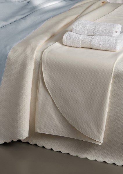 Copriletto tradizionale con perimetro rifinito a smerlo su tre lati, realizzato in morbido piqué a piccoli rombi e disponibile nei due colori basici bianco e avorio, per abbinarlo facilmente con qualsiasi completo letto e per dare un tocco vintage anche agli ambienti più moderni.