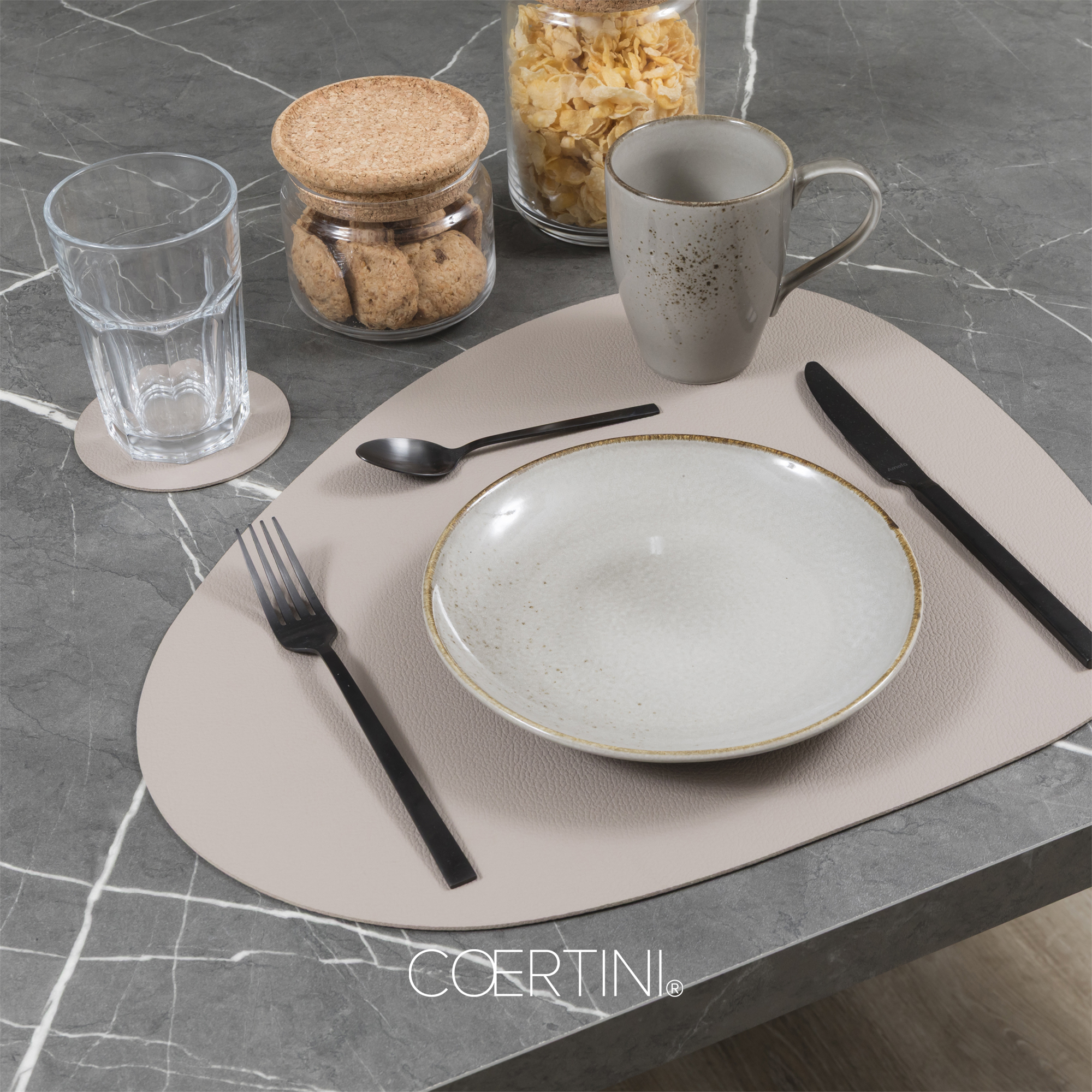 Tovaglietta a goccia linea TOAIA di Coertini, misura 43X37 cm, colore TORTORA, effetto similpelle, resistente e facile da pulire.