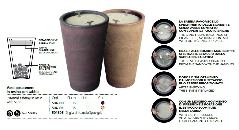 Vaso posacenere in resina con sabbia, con setaccio e tappo separatore
